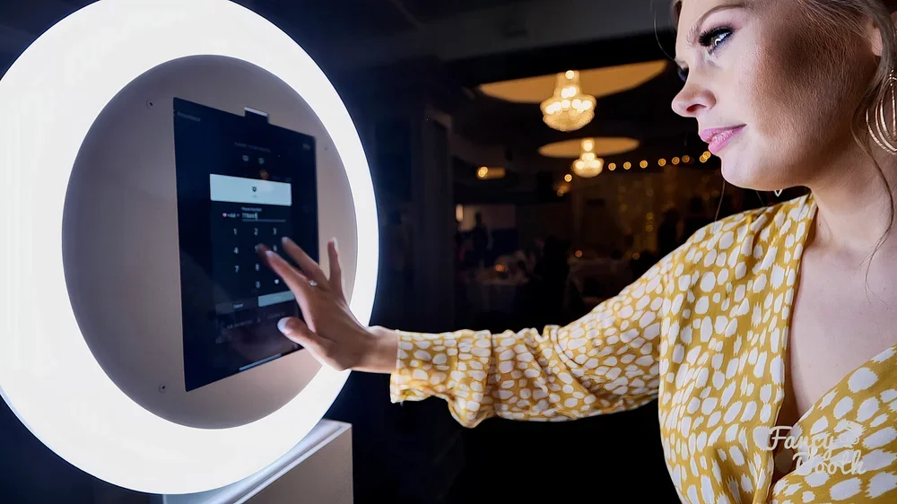 A sleek digital kiosk with a 12.9-inch touchscreen, AR filters, GIFs, and boomerangs. Takes up minimal floor space — great for backyard parties, smaller venues, or events where the dance floor is the priority. No prints by default (printing available as add-on), but instant digital sharing to every guest's phone. Perfect for teen parties and 21st birthday celebrations where social media sharing is part of the fun.
